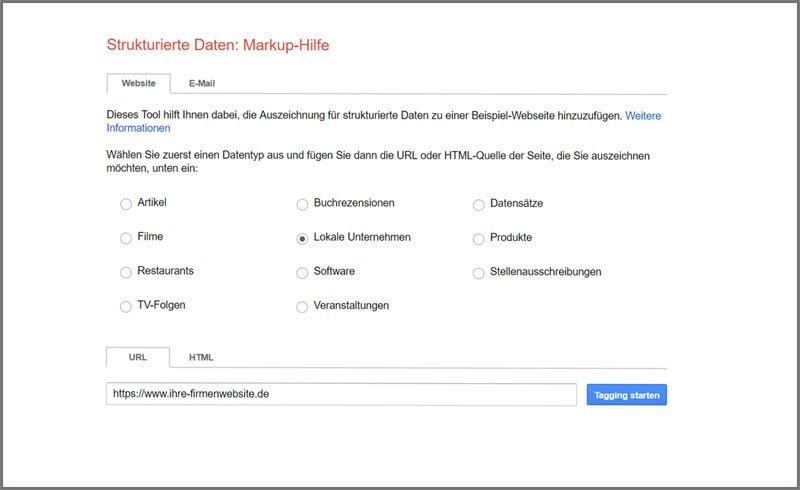 Geben Sie in das Feld „URL“ Ihre Website-URL ein, markieren Sie „Lokale Unternehmen“ und klicken Sie dann auf Tagging starten.